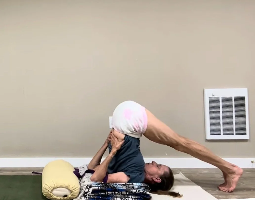 We finish in Sarvangasana with variations: Halasana, Supta Konasana, Parsva Halasana and Karnapidasana before settling into Supta Baddha Konasana.