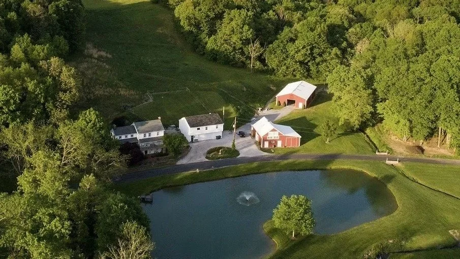 An aerial view of heron’s Hollow. The Main House is on the left, The Loft is in the middle and The Barn is on the right.